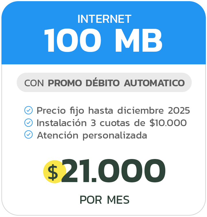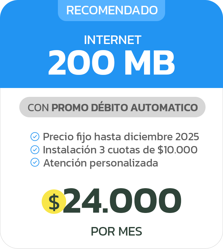 Ofrecemos hasta 200 Mb de velocidad real, ideal para navegar, trabajar, estudiar y disfrutar de streaming o juegos en línea sin cortes.